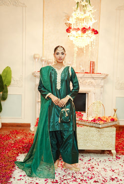Regal, radiant, and gracefully timeless — Afsara is a masterpiece of traditional artistry woven with modern refinement. Crafted on rich silk, this ensemble features handmade lace accents harmoniously blending textures with cutlines that speak of elegance and cultural heritage. Every stitch and surface detail reflects intricate craftsmanship, making Afsara a perfect choice for grand festive occasions.