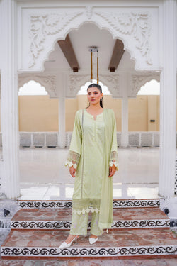 This 2-piece printed lawn set features a flowy shirt and matching trouser, making it a perfect pick for daytime outings and seasonal wear.