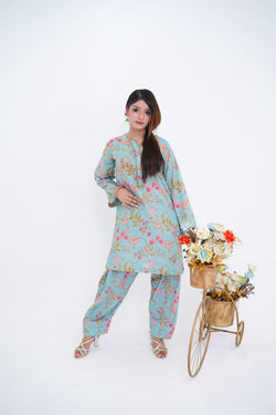 This 2-piece printed lawn set includes a beautifully detailed shirt and matching trouser—ideal for casual elegance and seasonal wear.