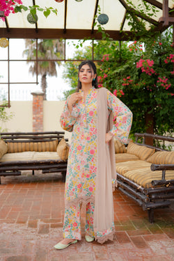 Embrace timeless elegance with this beige ensemble, beautifully highlighted with multicolor florals and soft pastel accents. The design is refined with delicate small embellishments on the sleeves, adding just the right touch of charm and sophistication. A versatile look that radiates effortless grace, perfect for both casual gatherings and festive occasions.