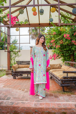 Grace meets charm in this light olive ensemble, beautifully adorned with blooming pink accents. Delicate lace detailing on the neckline, sleeves, and borders adds a feminine touch, while the embellished neckline elevates the design with subtle glamour. A perfect balance of freshness and elegance, this outfit is ideal for festive gatherings and chic daytime occasions.
