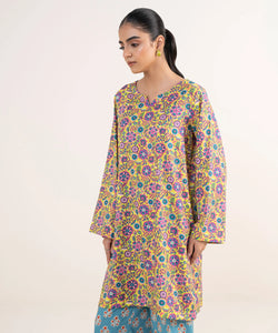 Colorful Pakistani two-piece suit with a vibrant yellow floral kurta and blue printed trousers. This lively, comfortable ensemble is perfect for adding a pop of color to your casual wear.