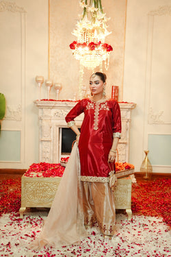 Radiating warmth and sophistication, Sahrin is a timeless celebration of elegance and craftsmanship. Designed on luxurious silk, it features handmade lace detailing and block print embellishments, beautifully composed to reflect the spirit of festive artistry. The ensemble’s graceful drape and refined hues create a look that feels both regal and effortlessly modern.