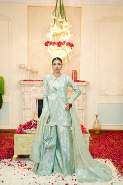 Royal charm and artisanal beauty, Velmirah is an ode to timeless craftsmanship. Designed on rich silk fabric, this exquisite ensemble features a fusion of handmade laces and blending traditional artistry with modern elegance. Each detail reflects careful handwork and a touch of luxury that made it formal.